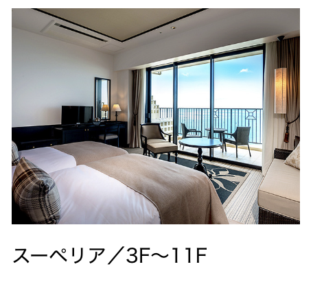 スーペリアに宿泊しました。カーテンを開けるとオーシャンビュー!リゾート感万歳!!きて良かった!部屋も広く、家族3人でも窮屈に感じることはなかったです。トイレ・バス別。